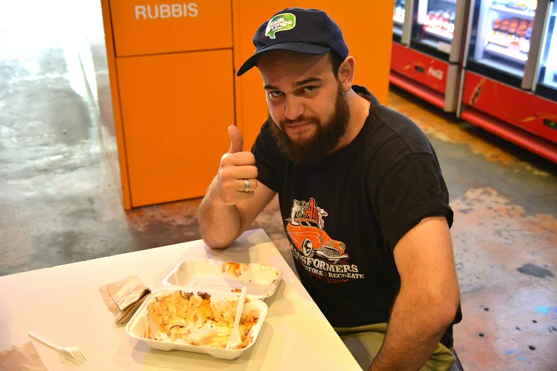 When we arrived at the Red and White, Brandon pointed out to us an old photograph of himself stuck to the cafe walls. It had been taken during an earlier AB eating challenge. The contrast is stark: